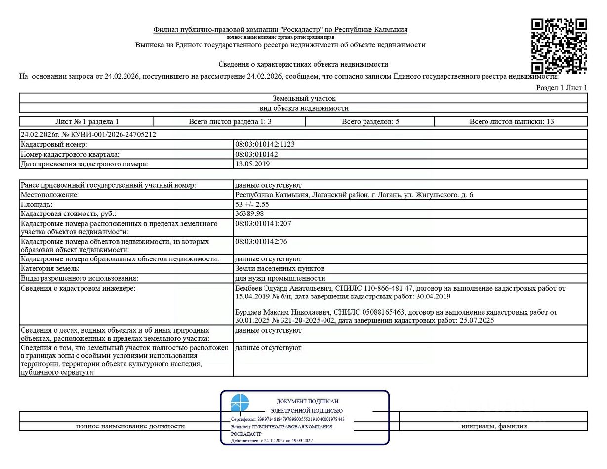 Земельный участок площадью 53 кв. м, категория земель - земли населенных пунктов, вид разрешенного использования - для нужд промышленности, кадастровый номер 08:03:010142:1123, местонахождение: Республика Калмыкия, Лаганский район, г. Лагань, ул. Жигульского, д. 6. Вид права - собственность. Обременение - арест, запрет на регистрационные действия. Собственник - Джеляева Т.А.