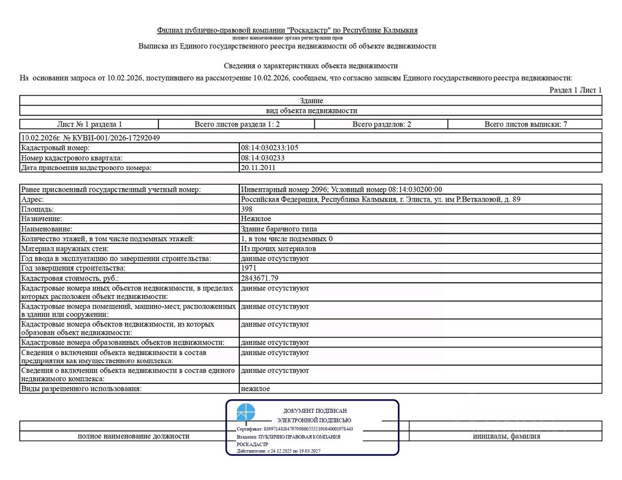 Здание барачного типа площадью 398 кв. м, назначение нежилое, количество этажей 1 (в том числе подземных - 0), кадастровый номер 08:14:030233:105, местонахождение: Республика Калмыкия, г. Элиста, ул. Р. Веткаловой, д. 89. Вид права собственность. Обременение арест, запрет на регистрационные действия. Собственник ООО "Калмремавто" (ИНН 0814120635, ОГРН 1030800759274).